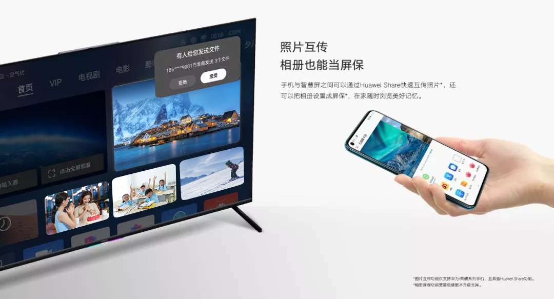 智慧屏支持Huawei Share功能,实现手机和大屏端互传图片,实现20秒传输600Mb。用户也可以把游戏画面投到智慧屏上,由于时延很低不必担心操控换面不对等的情况出现。